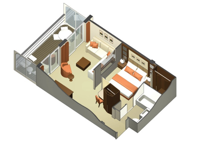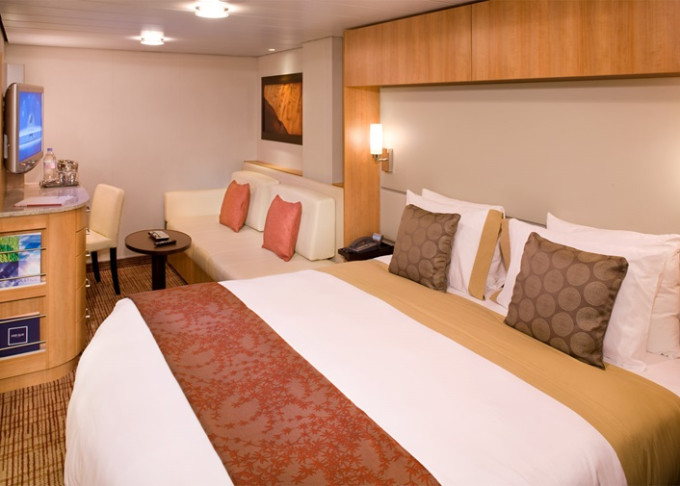 • Kajuty sú umiestnené v blízkosti lodného Spa. K ich vybaveniu patrí posilnený systém vzdušnej filtrácie, posteľ Queen-Size (v kategóriách Edge King-Size), veľké zasúvacie sklenené dvere, exkluzívne posteľné prádlo eXhale®, veľkorysé skladovacie priestory.