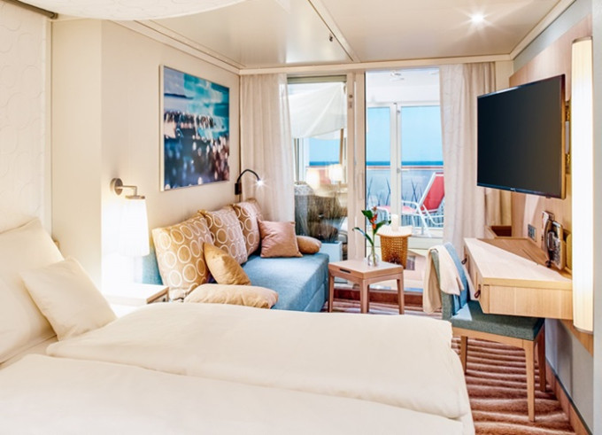 VB - Kajuta s verandou Komfort PREMIUM od 17 m² + balkón od 4 m². 9. až 15. paluba. Max 4 osoby. Cenový model Premium. 1 930 € 965 € za osobu