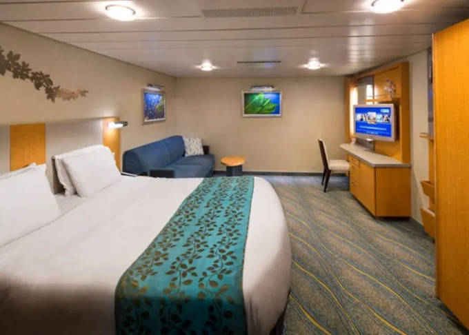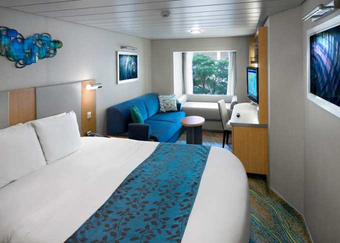 2T - Vnútorná kajuta s oknom / Promenade View 18 m². Neotvárateľné okno (výhľad na Royal Promenade). 7. paluba stred, vzadu. Max 5 osôb. 3 120 € 780 € za osobu