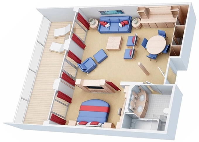 J3 - Junior Suite s balkónom 27 m² + balkón 7 m². 7,8,14. paluba. Max 4 osoby. Výhody Royal Suite Sea Class. 6 043 € 6 043 € za osobu