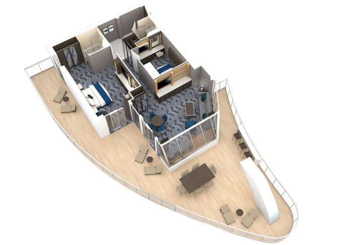 | A1 - Spacious AquaTheater Suite / 2 spálne 76 m² + balkón 71 m². 2 spálne, 2 kúpeľne. 8. paluba. Max 4-8 osôb. Výhody Royal Suite Star Class. | 9 052 € 2 263 € za osobu |