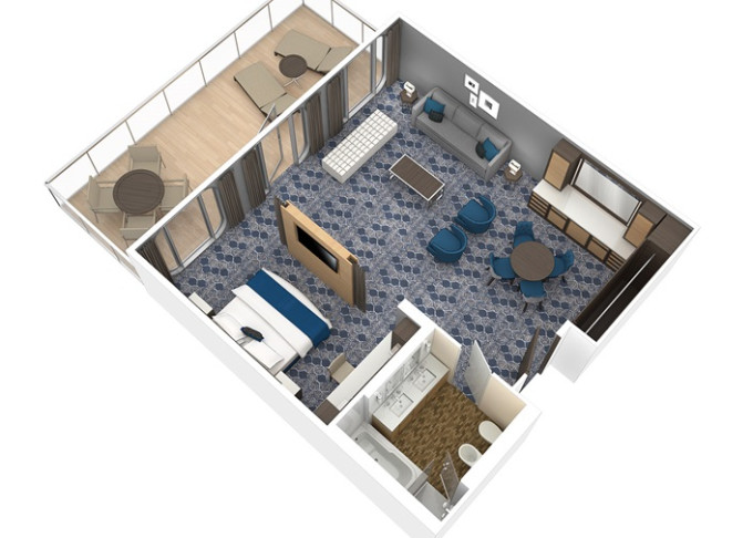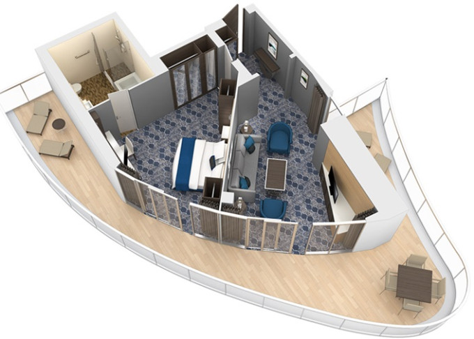 | OS - Owner’s Suite 52 m² + balkón 23 m². 18. paluba. Max 4 osoby. Výhody Royal Suite Sky Class. | 4 684 € 4 684 € za osobu |
