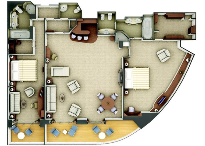 | R2 - Royal Suite 2 105-110 m² + balkón 16-17 m². Royal Suite R1 spojená s Veranda Suite. 6,7. paluba vpredu. Max 5 osôb. | 173 200 € 43 300 € za osobu |