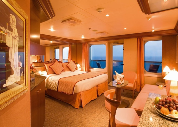 - Ubytovanie v kajute vybranej kategórie. Základné vybavenie: kúpeľňa s WC a sprchovacím kútom, 2 lôžka spojiteľné do manželskej postele, skrine, nočné stolíky, toaletný stolík a stolička, nastaviteľná klimatizácia, interaktívna satelitná TV s plochou obrazovkou, trezor, sušič na vlasy, uteráky a posteľné prádlo, Wi-Fi pripojenie (za poplatok), 24/7 kajutová služba (za poplatok).