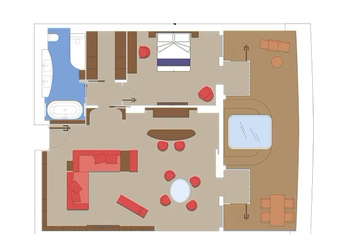 | YC3 - Yacht Club Royal Suite s vírivou vaňou 51-59 m² / balkón s vírivkou 42-51 m². Oddelená obývačka a spálňa, šatník, kúpeľňa s vaňou. Max 4 osoby. 16/18. paluba. Cenový model MSC Yacht Club. | 8 910 € 8 910 € za osobu |