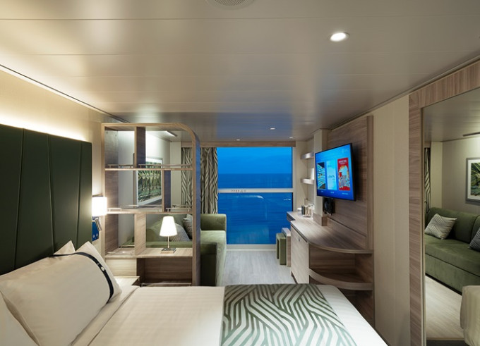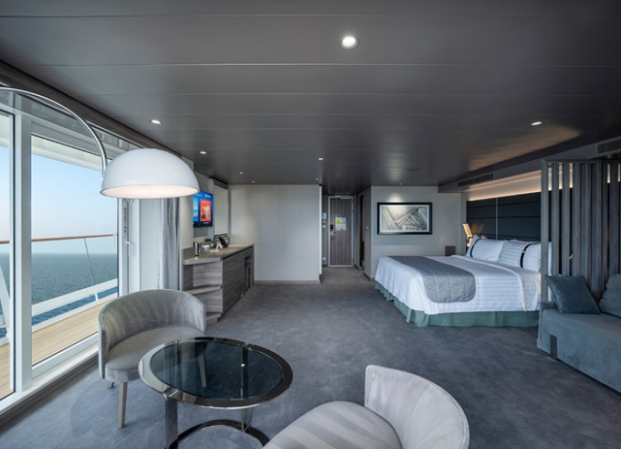 Vonkajšie kajuty Infinite s panoramatickým zasúvacím oknom, ktoré sa po otvorení zmení na sklenenú balustrádu.