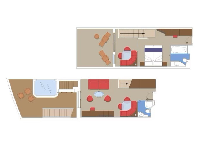 | YJD - Yacht Club Duplex Suite s vírivkou 46 m² + balkón 30 m². Vírivka. 2 podlažia, šatník, 2 kúpeľne (1 s vaňou). Max 4 osoby. 16. paluba. Cenový model MSC Yacht Club. | 7 110 € 7 110 € za osobu |