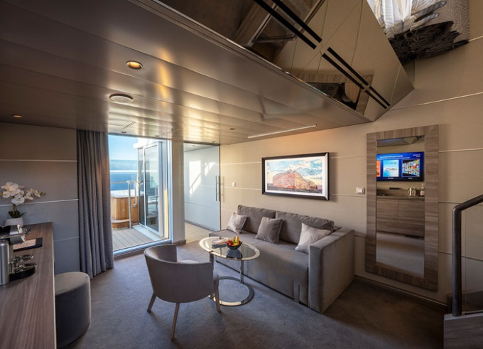 Luxusné dvojpodlažné apartmány MSC Yacht Club Duplex Suites s veľkými balkónm, privátnymi vírivkami, a s veľkou otvorenou obývacou / jedálenskou časťou .