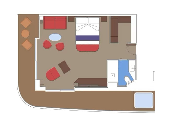 | YC3 - Yacht Club Royal Suite s vírivou vaňou 51-59 m² / balkón s vírivkou 42-51 m². Oddelená obývačka a spálňa, šatník, kúpeľňa s vaňou. Max 4 osoby. 16/18. paluba. Cenový model MSC Yacht Club. | 12 004 € 3 001 € za osobu |