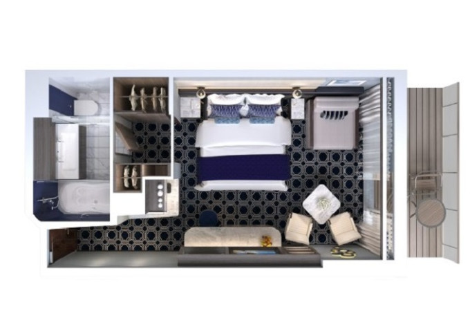| B6 - Kajuta s veľkým balkónom 31 m² / balkón 14 m². 8. paluba - vpredu. Max 4 osoby. | 2 448 € 1 224 € za osobu |
