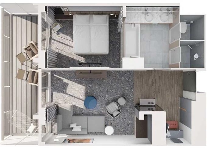| JKBO - Junior Suite s balkónom B 26 m² + balkón 7 m² so stoličkami a podnožkami. 8-12. paluba. Max 4 osoby. Výhody Junior Suite. | 4 058 € 4 058 € za osobu |
