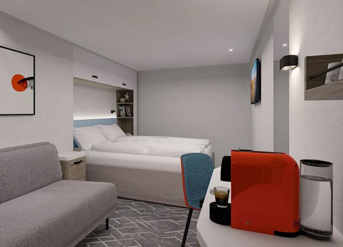 | SUWO - Weitblick Suite 45 m² + balkón 12 m² s hojdacou sieťou. Oddelená spálňa a obývacia časť, šatník. 14. paluba. Max 4 osoby. Výhody Suite. | 14 796 € 3 699 € za osobu | ||